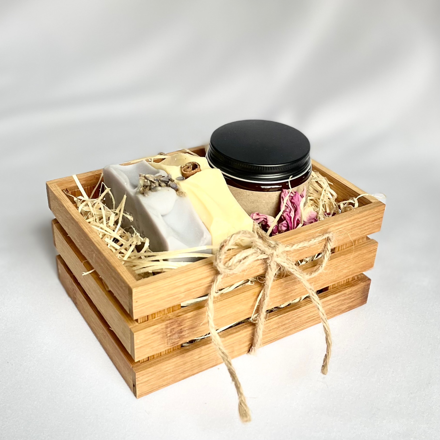 Zestaw prezentowy złożony z Mydła Lawendowego, Mydła Zimowy sekret i Masła pomarańczowego. Gotowy do wręczenia prezent zapakowany w bambusową skrzyneczkę.